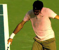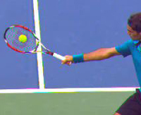 Rafa's arm movement is far less and at the other end of the extreme. Although his opposite arm does move backward somewhat, Rafa doesn't even straighten it, keeping the elbow bent and tucked in toward his waist. This is probably related to his increased torso rotation at the end of the movement and also the way his feet seem to come around further and sooner than Federer.