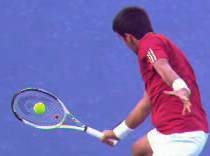 Let's see how the players come out of the wrap around backswing and start the racket down to the ball. Then let's follow the path of the racket to the contact, see how far the swing continues down, then see what happens in the followthrough.