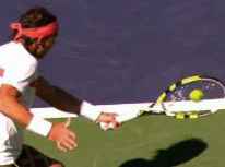 Interestingly, the swing plane on the slice is roughly the same angle as on Nadal's most extreme forehands with the over the head finishes (though moving in the other direction). Again, according to my very rough measurements, that swing plane angle is around 50 degrees. Whatever the precise measurements, it's obvioius the swing is radically high to low.