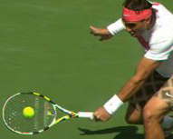 Watch how far to the player's right the racket moves after contact (to the left obviously for Nadal.) The swing actually appears to make something like a 90 degree turn.