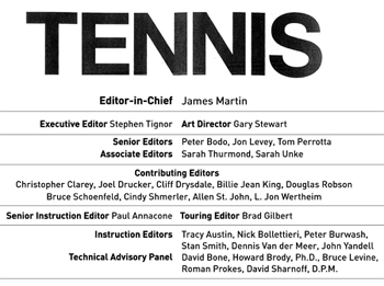 It's tremendously exciting because I have been asked to write detailed analytic pieces for the magazine, starting with a new article on Roger Federer's forehand later in the spring. I guess the editors have some confidence it will turn out ok, because you can already see my name right there on the masthead. I'm joining a pretty distinguished list of instructional editors, including Tracy Austin, Nick Bollettieri, Peter Burwash, Stan Smith, and Dennis Van der Meer.