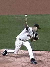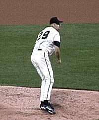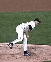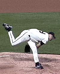 In contrast to Sampras above, the pitcher's weight remains on the front foot and the back leg has taken a long lazy step forward. |