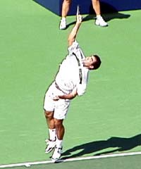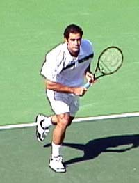 Note how Pete makes contact in the air. This is the difference in the role of the legs. The uncoiling is driving his entire body and his arm and racquet upward toward the ball.