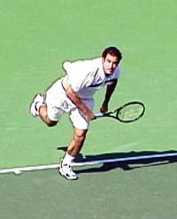 Compare this to Jason's leg. There is a long, almost lazy cross step forward and across his body with his back foot, the natural effect of the continuing momentum of his delivery. Unlike Pete, who takes this step as part of a movement pattern forward, the step for the pitcher is a natural consequence of the delivery. For the tennis player, stepping through the motion in any way that approximates the pitch is a technical kiss of death.