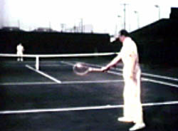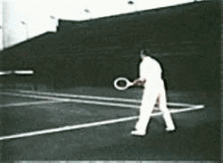 Footwork Budge assumed a sideways position with his right shoulder pointing toward the net for as long as possible. At the beginning of the stroke, the weight is on the rear foot then shifted to the front foot as the racket comes through. Very often, Budge would become airborne on his follow-through, an indication of the tremendous body weight he applied to the ball. The Racket Swing All great tennis strokes come naturally to players fortunate enough to possess them. Thought is replaced by instinct. Budge's backhand was a beautiful example. |