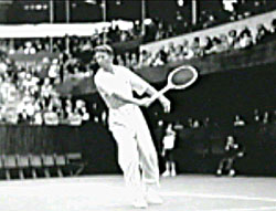 This element in Budge's stroke is unique in tennis. Most great shots are based on a more gradual acceleration of the racket to the contact point allowing the player to judge the pace of the oncoming ball before committing full power. Budge let the racket fly with full force, immediately. Blessed with 20/5 vision in both eyes, he possessed the uncanny ability to evaluate his opponent's shots almost instantaneously. Through his eyes, the game seemed to unfold in slow motion. The famous backhand was unique in one other respect. Most one handed backhands are hit with the arm closer to the body, so the arm is almost perpendicular to the ground. Budge, true to his baseball heritage, kept his arm at a diagonal through the critical part of the stroke. Budge's natural abilities and technique, combined with the 16 and ½ ounce racket, made him seem nearly in invincible on the backhand side. |