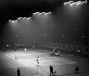 But in spite of the weather, over fifteen thousand fans turned out to see Bobby Riggs and his newly minted professional teammates—Jack Kramer, Dinny Pails, and Segura--play on a wooden surface laid over the ice hockey rink—a typical ad hoc court for pro tennis at that time, regardless of how cold the players' feet might feel.