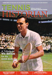 Most tennis people don't know that there are at least two tennis history organizations with memberships that include tennis collectors, writers and historians dedicated to preserving the rich history of the sport. The Tennis Collectors' Society (United Kingdom) started in 1987 and publishes 3 magazines annually that are now titled "The Tennis Historian." Richard Jones, who owns the Tennis Gallery bookstore in Wimbledon, is editor of this magazine.