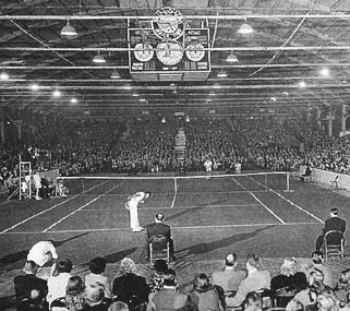 .Cool and composed, Bobby stuck to his game plan. "Every time I lobbed I could hear the crowd holding its breath to see where the ball would go," Bobby said. "Most of them fell within six inches of the baseline. Only three of them actually hit the clock. I must have lobbed him about seventy times during that match." In the second set, Bobby saved two set points, pulled even, and took the set, 9-7.