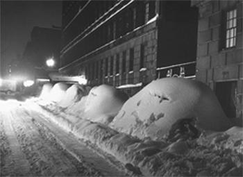 An eerie silence settled over the city. Traffic stopped. Fifth Avenue was white and vacant. Side streets were choked with thousands of stalled cars, busses, and trucks. Parkways were dotted with white mounds, each marking an abandoned automobile.
