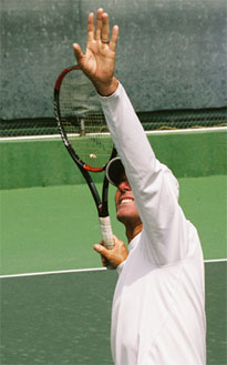In the first article, we looked at the use of the opposite arm in the groundstrokes. (Click Here.) Now I'll discuss what I feel is the correct usage of the opposite arm on the serve, overhead, the return of serve, and the volley. As in part one, all the descriptions will be for right-handers. Let's start with the serve!