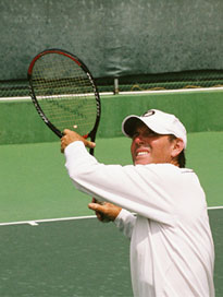 As with the groundstrokes, you should support the racket with the left hand by holding it at the throat. This actually spaces the hands correctly for the movement of the stroke motion. Using the left hand will also be very helpful if you're a player who changes grips. (Yikes! Work on the continental grip, please! )