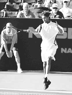 Lleyton Hewitt displays a low center of gravity distributed over his base as he lands from his split step. He maintains good upper body posture as he approaches the ball. Note his beautiful balance and wide base of support, with knees bent and his head pointing toward the hitting zone. |