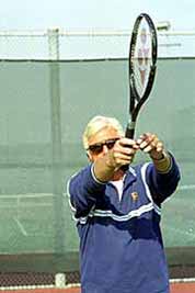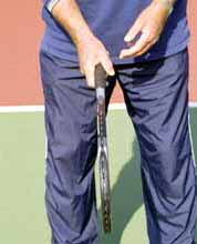 Semi Western:After a young player has developed the ability to hit the ball, it's acceptable for his grip to slide slightly toward a western grip to develop more topspin, as shown here. Note the difference in the followthrough compared to the classic grip above. |