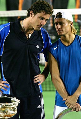 As precocious teens both joining the tour in 1998, the two faced off in their early years for crowds and paychecks--though much smaller on both counts than in Melbourne Park in 2005. They share the distinction of being the only players to have beaten Pete Sampras in straights sets in a slam final (Safin got him at the 2000 US Open and Lleyton got him the following year). Both times, the other buddy was Pete's semifinal opponent the day before. Both do things on the court that make the purists cringe. You've got Safin with the pouting, tanking and racquet-snapping, and Hewitt with the most bellicose persona since Connors. He's probably a little too macho to compare to the tortured genius of Johnny Mac. Maybe Pancho Gonzales?