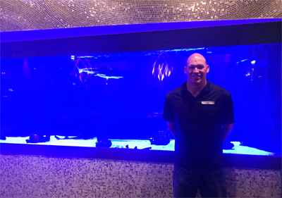 Kyle Lacroix in front of the shark tank. Look to the left to see one with its jaws open!
