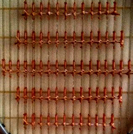 To do this, Fischer used only half the number of cross strings, but strung two main strings through each hole. A crucial point is that the strings were not interlaced (woven) with the crosses in the conventional way. Instead, the double mains straddled the crosses and were lashed together at multiple points.