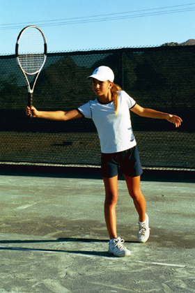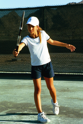 4. Step Forward and Beginning of Forward Swing The front anchor foot steps towards the net in a square or neutral stance. |