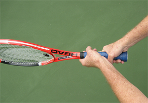 Remember that in the first article we saw that pro players generally used three grip variations with the bottom or dominant hand. The first is the continental, with the heel pad on top of the frame and the index knuckle rotated one bevel down.