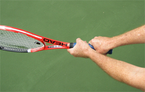 This grip is far more common with the men players. The result is that in the forward swing, the elbows and arms straighten out and also move closer together.