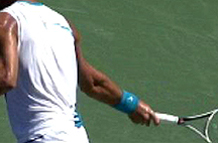 The top of the backswing is high, probably as high as any pro player we have studied, with the racket hand above head level and the racket tip also pointing upward, beveled backward at about a 45 degree angle to the court. Compare this to a player like Federer where the racket head reaches only about shoulder level and the racket tip points slightly forward. (For more on the complexities of the backswing in pro tennis Click Here.)