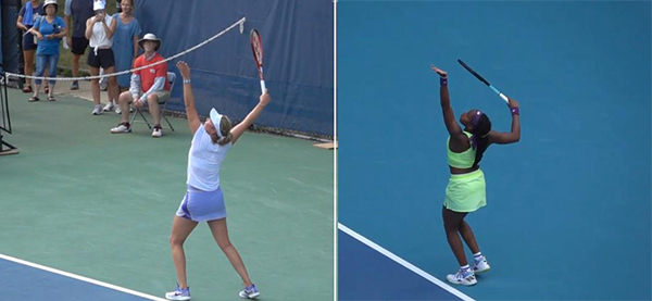 A swing with less than a full 180 degrees of shoulder rotation is limiting their service potential. Donna tends to finish with her racquet strings pointing down towards the court, while on some of my videos, Coco sometimes doesn't even reach that position. Other video examples are better than these but it's the lack of consistency that is a big concern.
