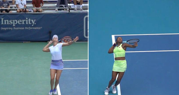 Coco doesn't have this "hitch", she achieves her "trophy position" directly with her abbreviated takeback. The tennis teaching community desires more of a direct line from shoulder to shoulder to elbow in the takeback. It's a more efficient backswing and should be more dependable when she needs it most.