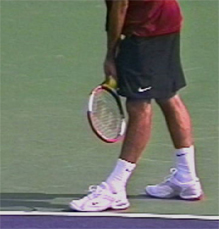 Why Roger? Roger Federer's motion is so smooth and effortless that it doesn't attract the same attention as Pete or Andy. What makes Federer less distinctive is probably what also makes him a better model. It's a simpler, more classical motion with fewer extreme elements. Roger's serve may not have the mph or be as dynamic looking as Andy Roddick's. It may not have as much topspin or be as unplayable as Pete's. But it would be hard to claim it isn't effective, and seemlessly integrated into his all court game. If you were to pick one service motion from the top players to use as a template for building or improving your serve, my opinion is that it should be Roger. So we'll take a look at his motion, element by element. In this first article we'll start with the grip, and the starting stance. We'll also address the windup or backswing, the racket drop, and the path of the arm and racket to the ball. In the next article, we'll continue the analysis with Roger's toss, leg action, body rotation, and his followthrough and then talk about how to put all the elements together for yourself.