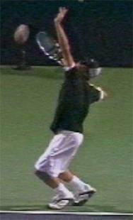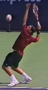 As the racket drops, the weight shift continues onto the front foot. Roger comes up on his back toes, and then his rear foot leaves the court. As we saw in our analysis of the stances, the majority of the push or drive in a platform stance is coming from the front leg. The rear foot is literally being pulled off the court. The leg drive off this front foot is very powerful. Look how far he explodes upward. That is definitely a lot of air. It is significantly more than Roddick or Pete, this is with the same or less knee bend. We noted that Roger's racket drop isn't quite as deep as these players, but he may be making up for it partially through the explosiveness of his legs. Like virtually every top player, Federer lands on his left front foot. Watch how he actually lands partially on the baseline, although on other balls he may land a few inches inside the court. More on this below. As he lands, his right leg kicks back in the other direction. The lower leg comes up until it is at about parallel to the court or a little higher. Here, once again Roger takes the middle path. His kick back with the opposite leg is a little more than Sampras but less than Roddick.