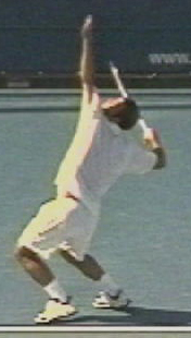 Leg Action A major commonality in the serves of good players is the use of the legs--the deep knee bend and the front foot landing. This is another topic I've addressed in detail both in the Sampras series (Click Here) and in the articles on the great myths in instruction (Click Here.) There are also examples in the Stroke Archive of virtually every top server showing the knee bend, the uncoiling, and the left foot landing. As I have argued before, I think the platform stance is probably superior at the higher levels and is also much easier to master for the majority of players.