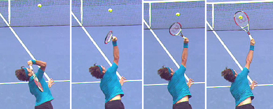 Ad Court Wide So let's examine what actually happens when Federer goes wide in the ad court. Watch the first animation of the wide serve that shows the total rotation of the hand, arm and racket. The elbow is extending, but the racket and hitting arm structure are rotating counterclockwise as a unit from the shoulder. This is driven by the upper arm. Watch again and focus in the upper arm. It also seems apparent that there isn't independent rotation of forearm (technical biomechanical pronation.) The racket and the forearm are along for the ride as the internal shoulder rotation drives the motion. At the start, as the racket starts upward, the plane of the racket face is basically perpendicular to the plane of the torso. Then, by the last frame of the animation, the racket head appears to rotated something like 180 degrees or maybe a little more, until it is just past perpendicular to the court surface. Down the T Now watch when the serve down the T. The same basic dynamic applies. There is substantial internal or forward rotation of the upper arm, and again the racket seems to turn over edge to edge.