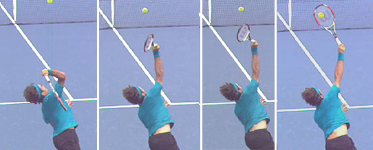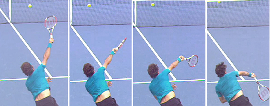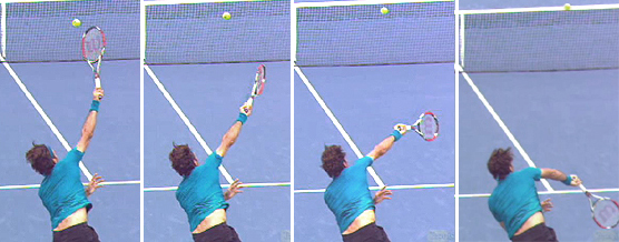 Again everything is driven by the upper arm and rotating as a unit. It's just that the total rotation is slightly less extreme. The racket face still rotates substantially counterclockwise, it's just that the rotation stops when the racket appears to be on edge or perpendicular to the court surface. The difference in the amount of rotation may be minimal, but it appears to account for the location differences in the serve. Think about it—the service box is 13 ½ feet wide. But this slight variance is enough to send the ball to locations 10 feet apart or more. Contact? As for the contact point itself, even in the high definition video, it's hard to say what the difference in the angle really is. Perhaps the racket face is turned more toward the outside on the wide serve, but I am just not sure I can see it in the video. That's ok though because it gives us something to look forward to in the results when we do get some quantitative measurements. A Closer Look