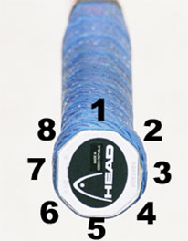 We created this new system by numbering the bevels on the racket handle, and then identifying two key points on the hand. The bevels were numbered 1 to 8. The key points on the hand were the base of the index knuckle and the center of the heel pad.