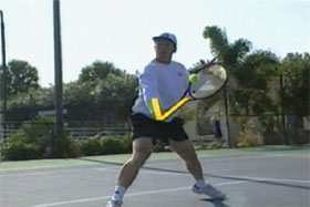 A perfect example of positioning the racquet face behind the bounce on the half volley.